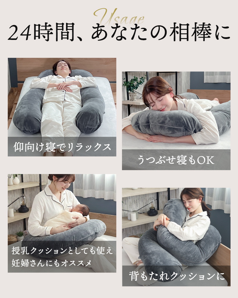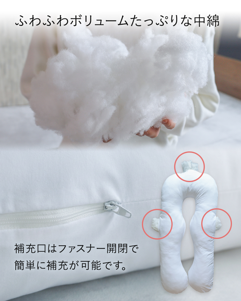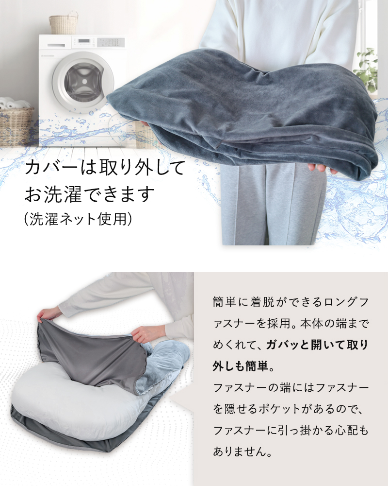 就寝時の快眠サポートはもちろん、ソファでの読書やスマホ操作の背もたれ、産後の授乳クッションとしても大活躍。大きく開くワイドファスナー設計でカバーの着脱も簡単。毎日使うものだからこそ、使いやすさと安全性に徹底的にこだわりました。