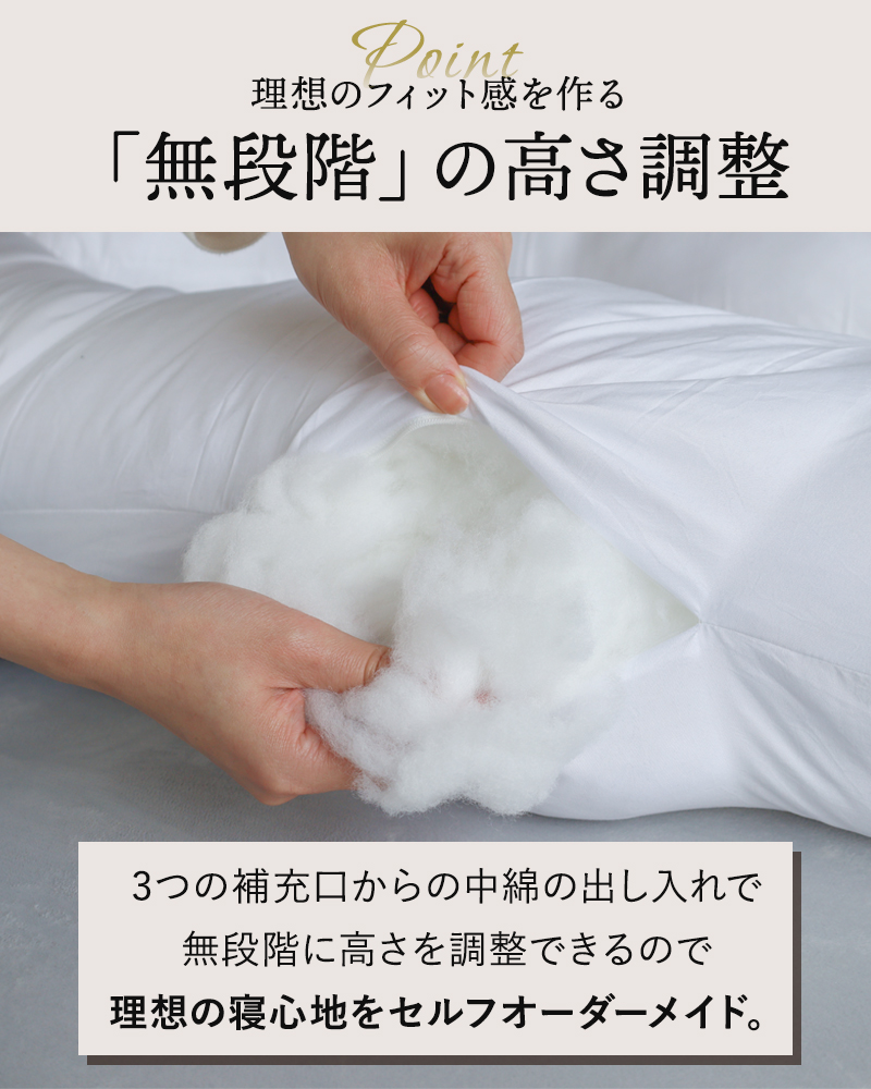 サイドファスナーから中綿を自由に出し入れできる設計を採用。1cm単位でボリュームをコントロールできるため、体型や好みに合わせた「自分だけの正解」が作れます。既製品の枕では満足できなかった「枕難民」の方にこそ試してほしい、究極のカスタマイズ性です。