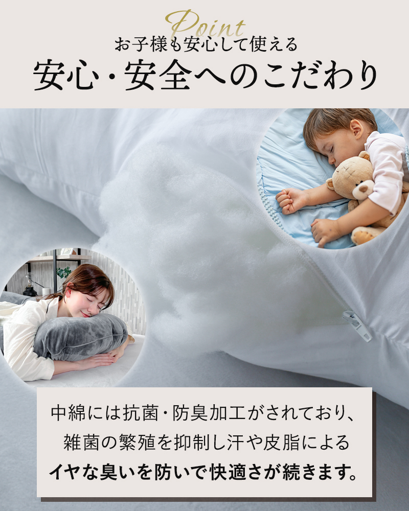 中綿には抗菌・防臭加工を施し、雑菌の繁殖を抑制して汗や皮脂によるイヤな臭いを防いで快適さ続く。さらに、シリコン加工によって、圧縮梱包を開けたときに復元しやすくなっています。