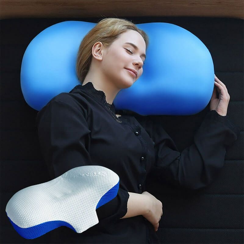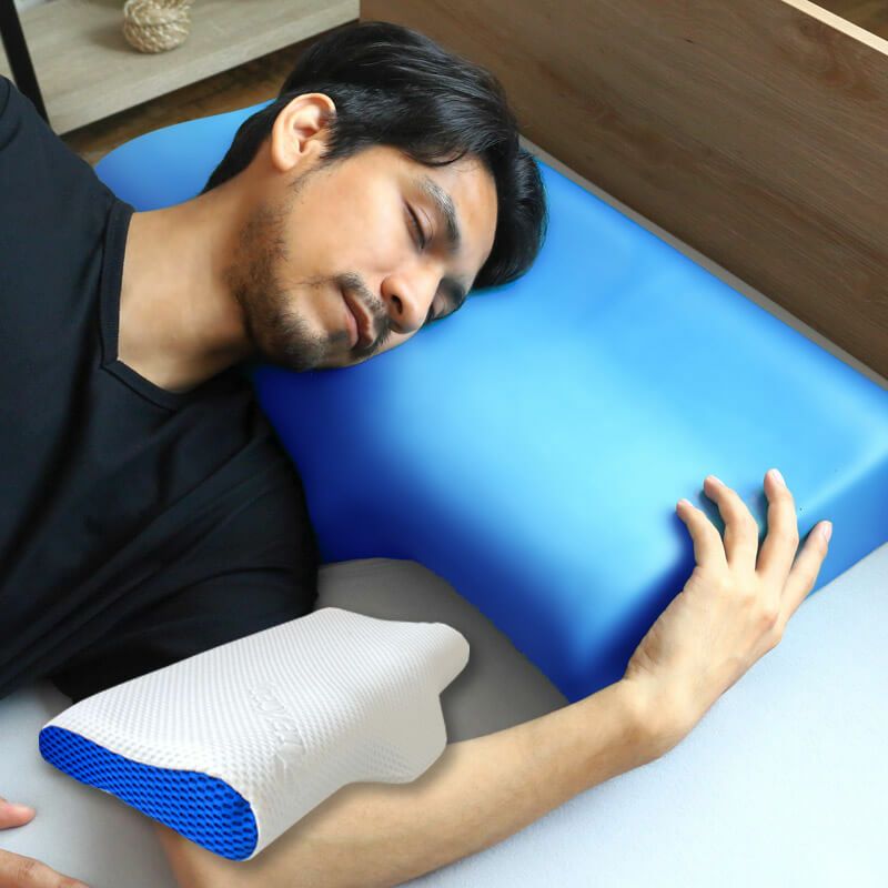 首部分の窪みに首がスッポリ収まって効率よく休める頸椎安定ピロー【アートマン】。横向き寝の場合でもせり上がった形状の下に肩・腕が入り込み収まりが良く、仰向け寝でも横向き寝でも◎。