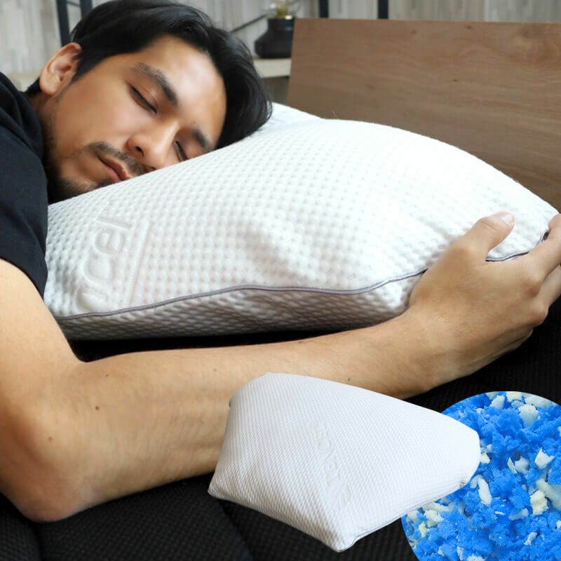 ブルーブラッド素材をチップ状にした、ふんわり柔らかな大きめホテルピロー【ヘキサゴン】。六角形の形状が腕・肩にあたらずうつ伏せ寝もしやすい枕です。