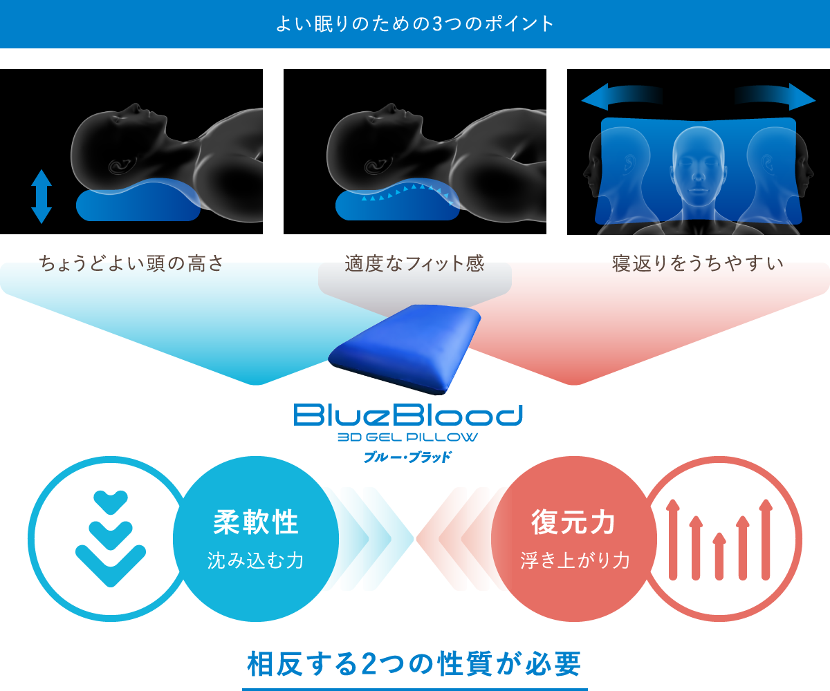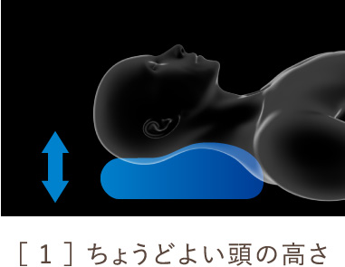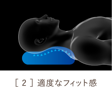よい眠りを導き出すには、ちょうどいい頭の高さ、適度なフィット感、そして自由に寝返りをうてること、この3つのポイントが揃うことが必要です。