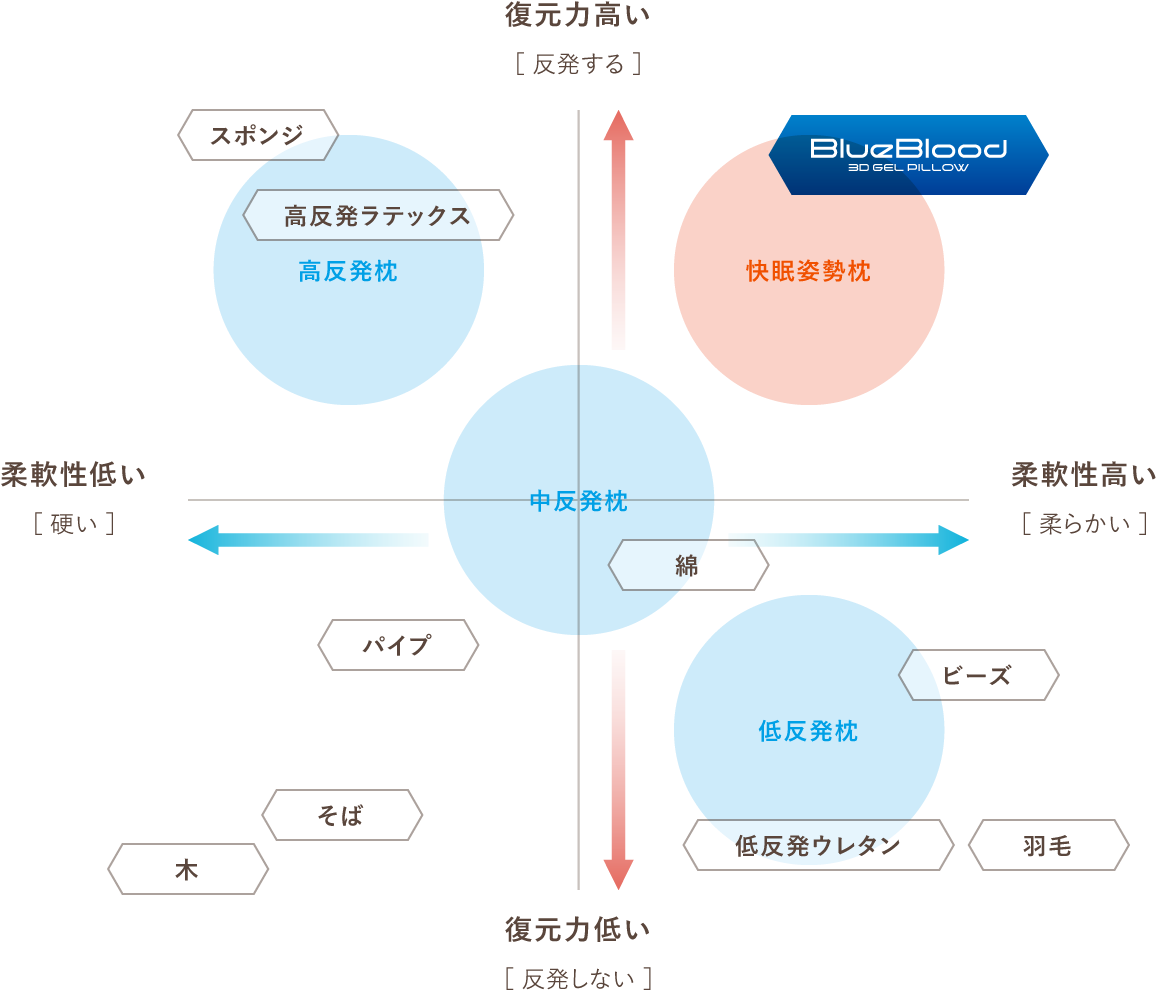 よく眠れる枕の理想は、反発力が中~高程度で柔らかいこと。ブルーブラッドはこの領域を実現できる希少な枕と言えます。