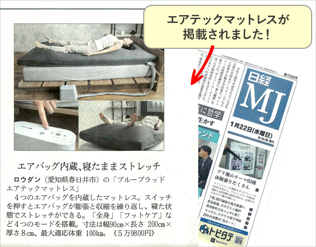 入眠環境を整える動的寝具【エアテックマットレス】が2025年1月22日発刊「日経MJ」に掲載されました。