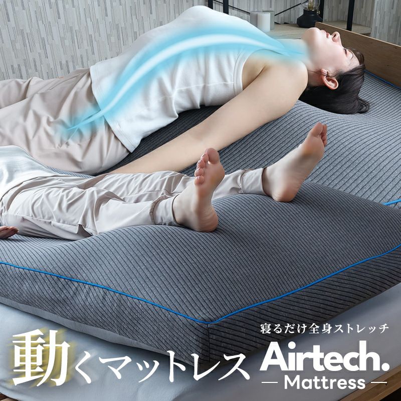 エアテックマットレスは、睡眠前の軽いストレッチをサポートして、入眠環境を整える”動くマットレス”です。起動ボタンを押せば内蔵されたエアバッグが4パターンのモードで膨張・縮小し、寝ているだけで身体のストレッチをサポート。寝つきが悪い、眠りが浅いなどのお悩みの方におすすめの商品です。