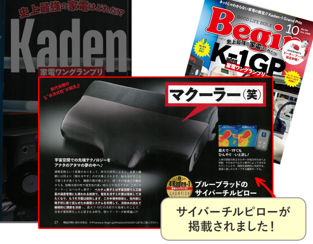 雑誌「Begin」に、頭を冷やす冷却枕【サイバーチルピロー】が掲載されました。 2025.08.182025.11.26 応援購入サイトMakuakeにて応援購入総額1,400万円以上を達成した冷却まくら【サイバーチルピロー】が、雑誌『Begin』で紹介されました。 「家電ワングランプリ」記事の中で紹介されています。 半導体冷却枕 [Cyber Chill Pillow(サイバーチルピロー)]|BlueBlood.Shop脳をクールダウン 深く眠るためのスリープギア!半導体による究極の冷却枕