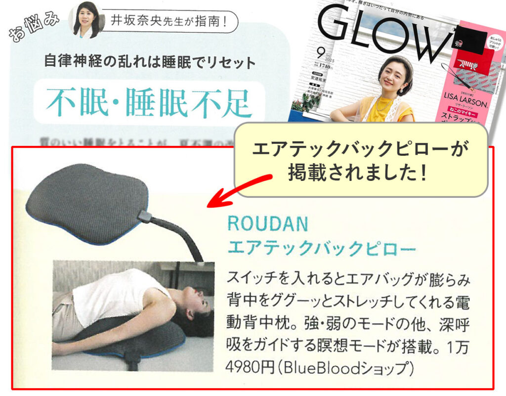 雑誌「GLOW」に、動く背中まくら【エアテックバックピロー】が掲載されました。 2025.07.292025.11.26 スイッチを押すとエアバッグが膨らんで背中を押し上げる、電動背中枕【エアテックバックピロー】が、雑誌「GLOW」(2025年9月号)の『夏の自律神経リセット術』記事内、「不眠・睡眠不足」パートに掲載されました。 動く背中枕[Airtech Back Pillow(エアテックバックピロー )]|BlueBlood.Shop「寝床でのストレッチや軽運動」が睡眠に良い環境を与える点から、睡眠環境・寝具指導士が動的寝具の開発に取り組み、完成した次世代「背中枕」