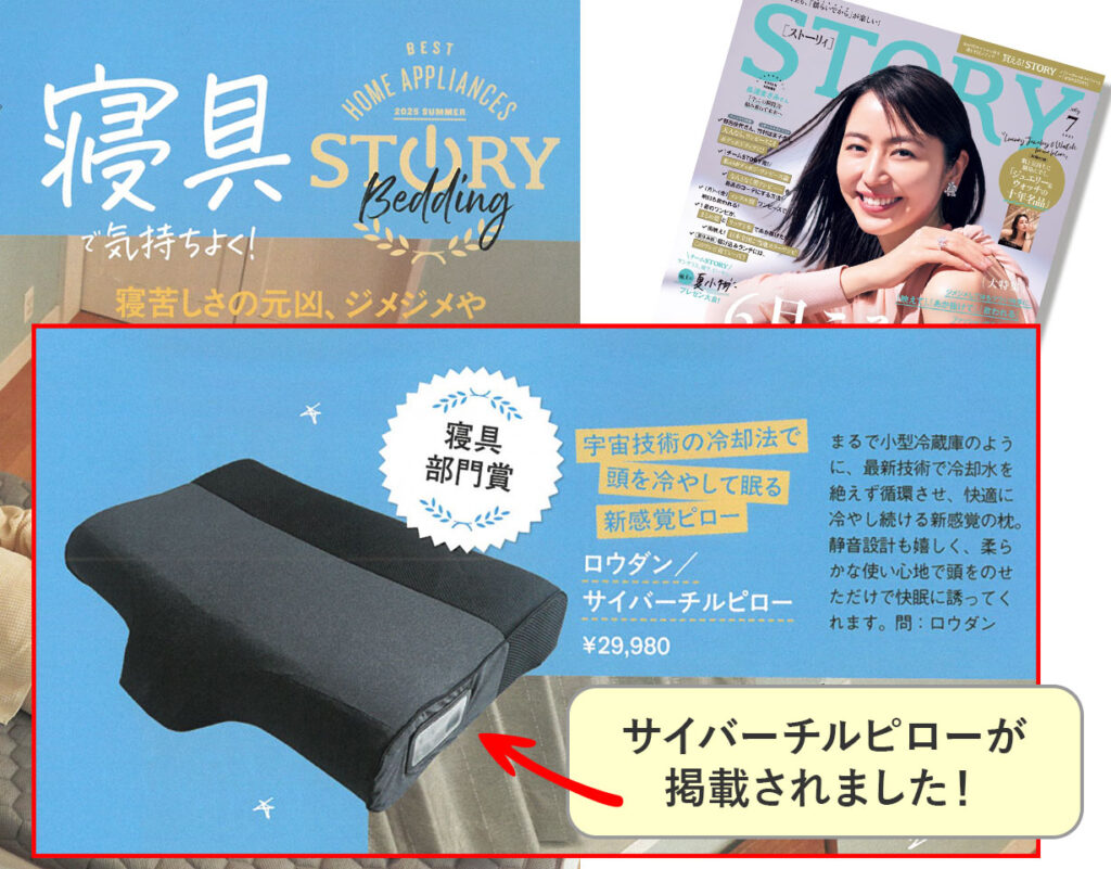 応援購入サイトMakuakeにて先行販売中の冷却まくら【サイバーチルピロー】が、雑誌「STORY」(2025年7月号)の『大人を”快眠”へみちびく「夏家電」』記事で、「寝具部門賞」商品として掲載されました。