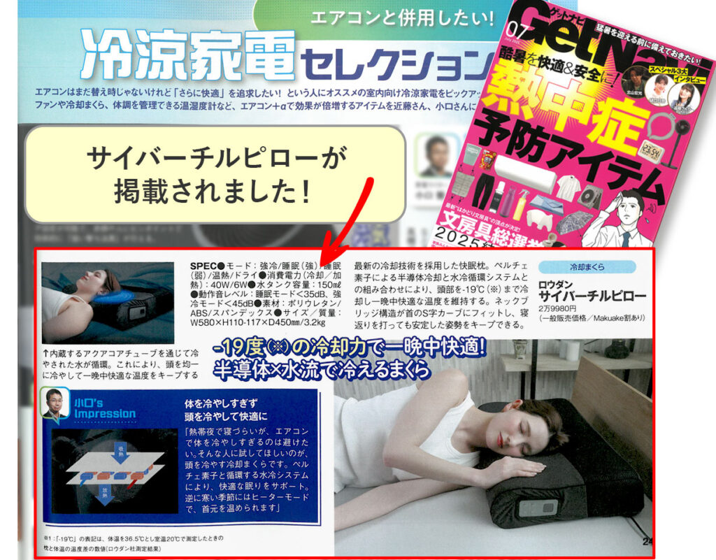応援購入サイトMakuakeにて先行販売中の冷却まくら【サイバーチルピロー】が、雑誌「GetNavi」(2025年7月号)の熱中症予防アイテム記事内の「冷涼家電セレクション」に掲載されました。